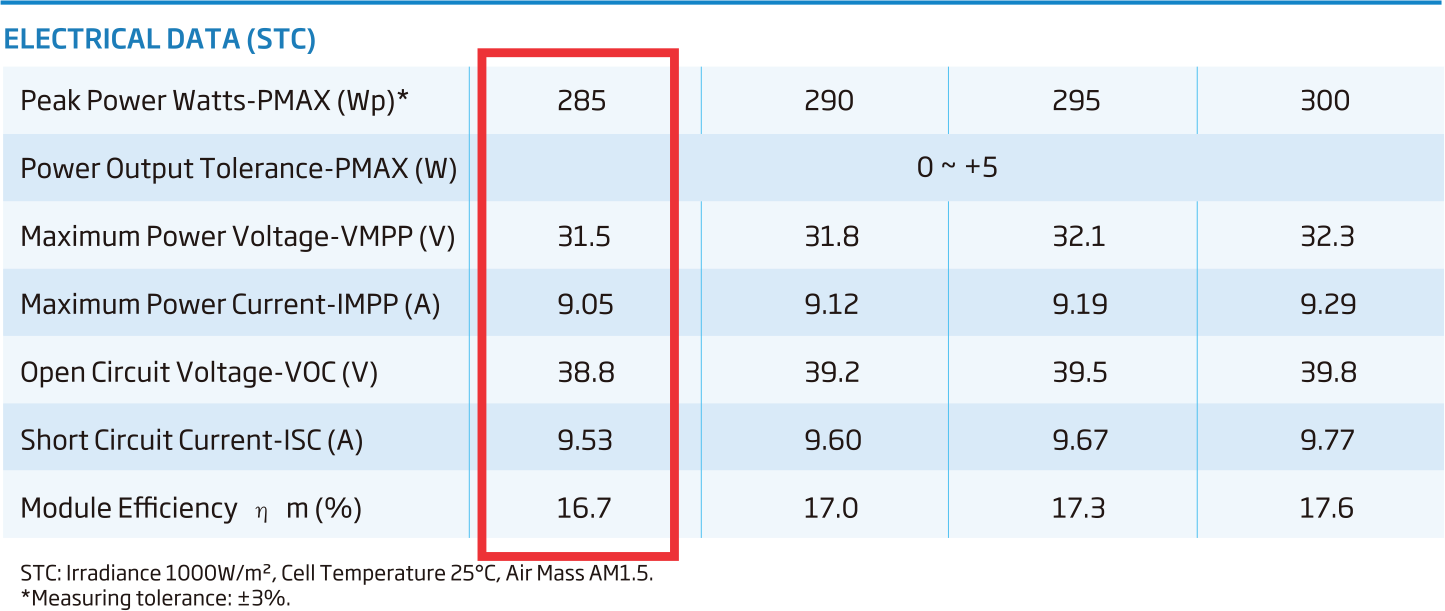 POLICRISTALINO Marca: Trina Solar POTENCIA: 285W Celdas: 120 VMPP: 31.5V IMPP: 9.05A VOC: 38.8V ISC: 9.53A Eficiencia: 16.7%